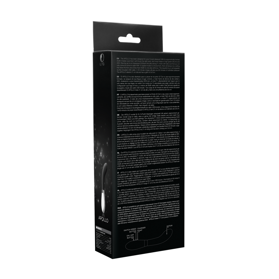 ¡El APOLLO ha sido diseñado para tu placer en el ! ¡Con su eje ergonómicamenteformado, se asegura de que llegue al lugar correcto, y más! Hecho de silicona de alta calidad yABS. Acelerando a unas impresionantes 5200 rpm, el motor F1 ultrarresistente hará ¡seguro que nosolo vienes sino que llegas con estilo! Con modos de 10 velocidades para elegir, siempre será unaconfiguración que haga el truco y a menos de 55dB nadie más lo sabrá. Este hermoso juguete esrecargable a través del cable USB incluido. ¡Una carga de 30 minutos te dará 60 minutos de placerdesenfrenado! El APOLLO mide 21 cm de alto y tiene una circunferencia de 3,6 cm.