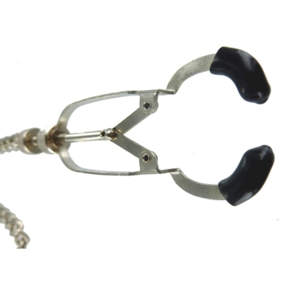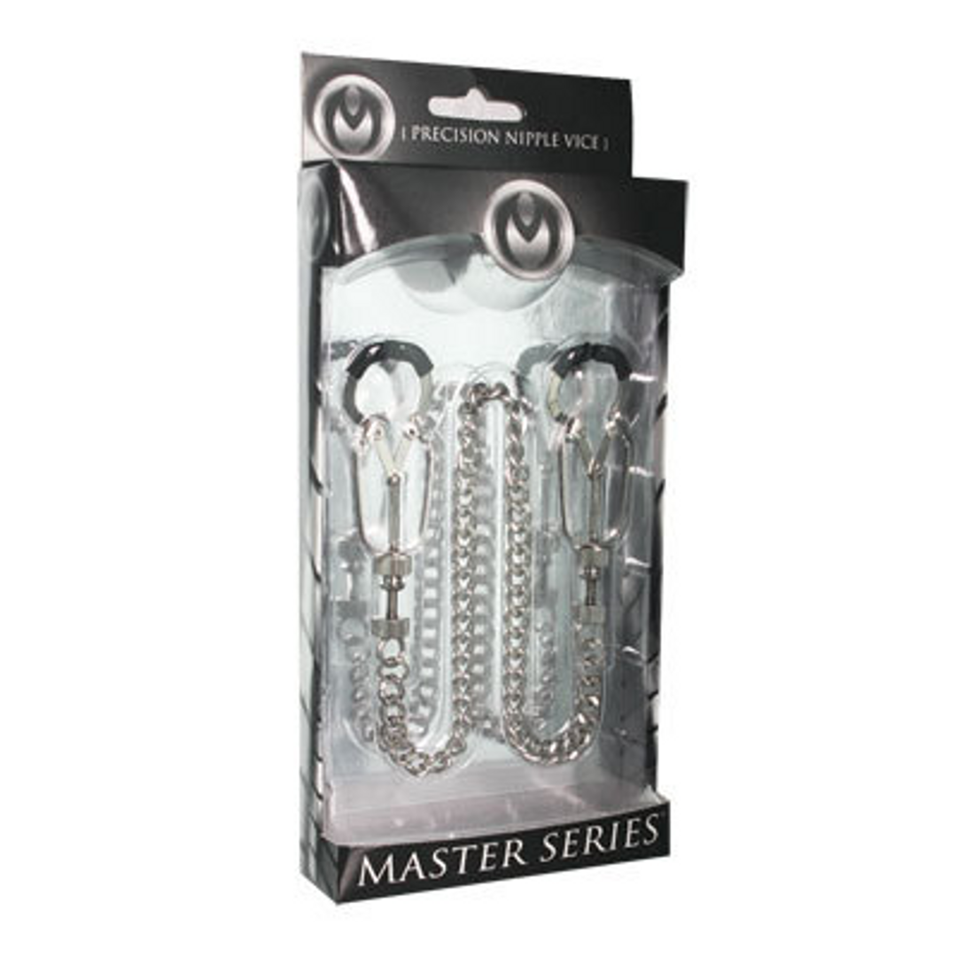 Diseñado para brindar precisión y resistencia, el Nipple Vice Bauhaus viene con dos abrazaderas que se pueden ajustar al nivel deseado de ajuste con los tornillos de ajuste ubicados en la base. Las puntas están cubiertas de TPR suave con la adición de una delicada curva en el extremo que ayuda a agarrar la piel del sujeto. Para finalizar esta pieza dominante, se agrega una cadena de conexión de 12 pulgadas que se ve tan tentadora cuando cuelga de los pezones cautivos de su juguete.