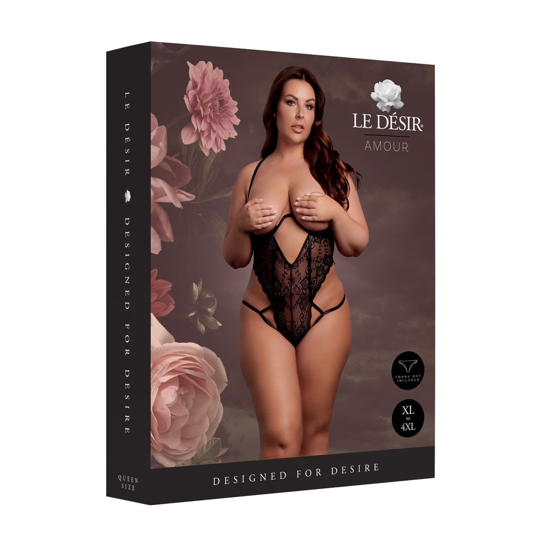 Body de encaje con aros y copas abiertas con deslizadores ajustables – Talla grande – Negro
