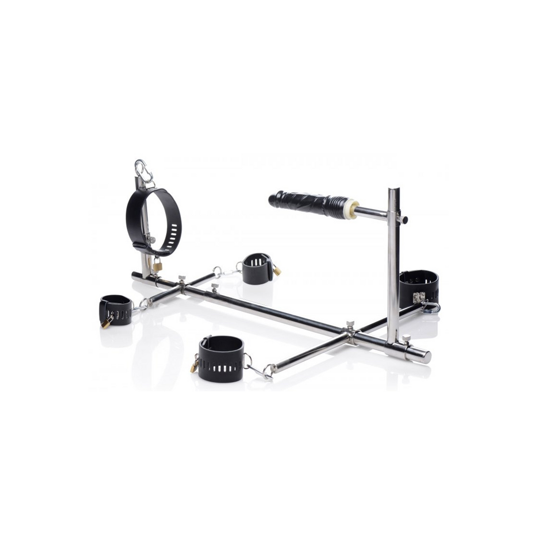 ¡Castiga y complace a tu juguete en este peculiar giro en una empalizada! ¡Sujete a su amante por el cuello, ambas muñecas y los tobillos mientras son penetrados por una polla negra venosa! Todas las partes de este notable artilugio son ajustables, por lo que puede extender la barra base, personalizar la altura del consolador y el collar, y modificar la ubicación de las muñecas y los tobillos de sus amantes. La construcción no podría ser más fácil, con simples tubos de conexión atornillados. ¡Los lujosos y resistentes puños están terminados con un soporte de bloqueo para garantizar que no se escapen y un anillo en D para conectarlos a la empalizada o incluso usarlos en otras escenas de bondage! Enriquece tus fantasías BDSM a medida que cobran vida con un instrumento único para la penetración cerrada.
